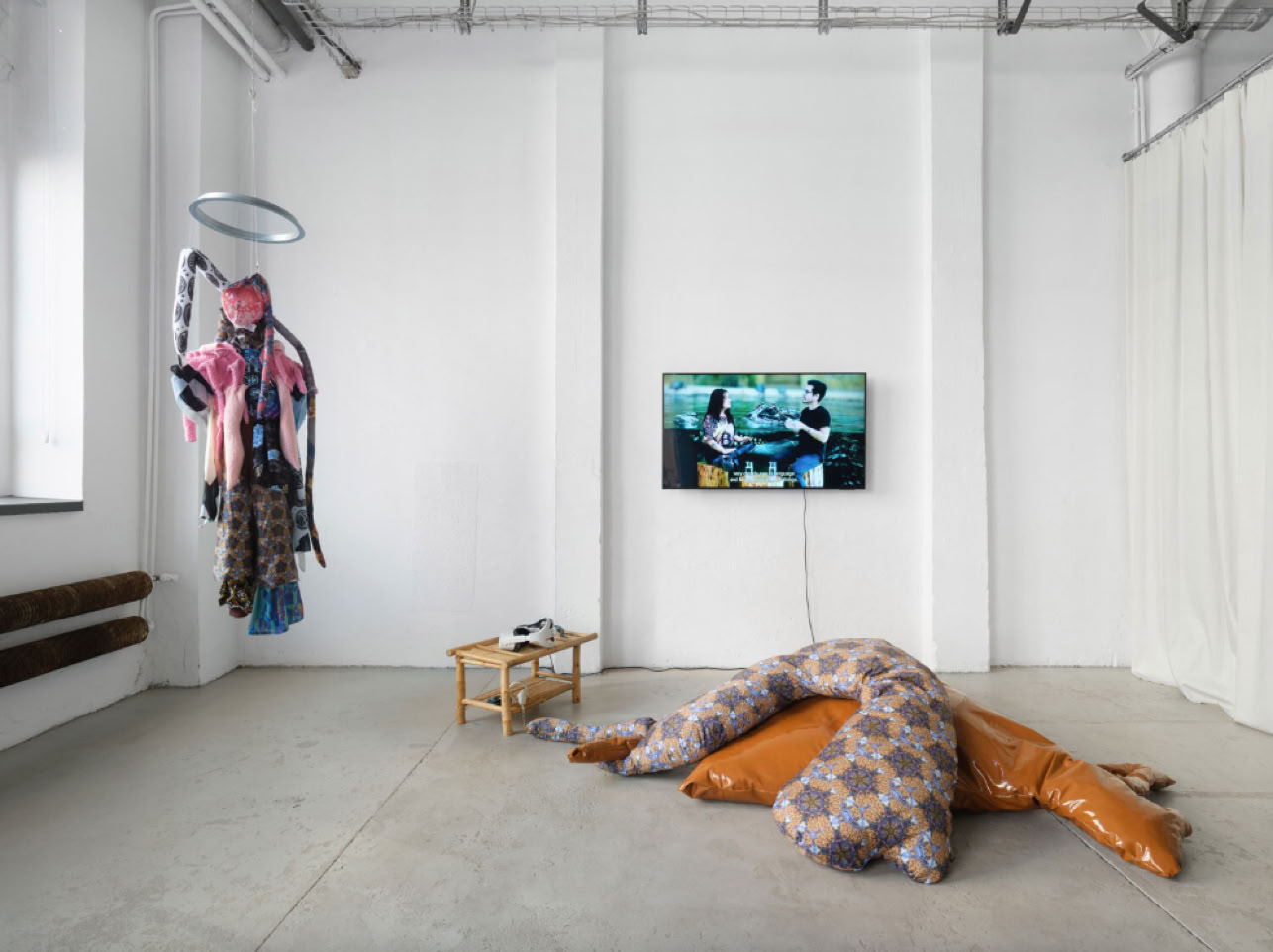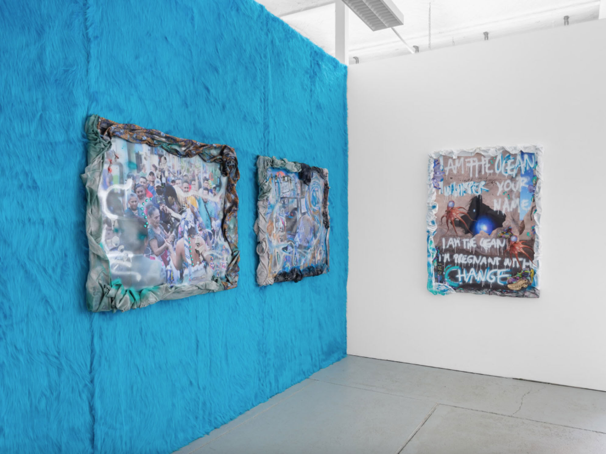 As an exhibition and installation, Cripto Sirenas expands into the physical space through an assemblage of different artifacts and media. The body and world as lovers and their transformations and mutations via technology become the central theme. Works are created through abstraction of the artist's bodies or by stilling their movement. Patterns created from documentary photographs and 3D stocks are printed onto fabrics, which morph into costumes for the performances within the video, and are then reconfigured into sculptural works depicting Sirena’s spirits in the exhibition space. Photographs of the artists’ bodies performing are abstracted and remade into geometric prints. Custom textile sculptures conceptualized by Sunny Pfalzer reference scenes from the video's choreography and morph into seating and cuddling sculptures for the visitors of the exhibition. A series of large mixed media collage works expands on the artists’ joint narrative and vision - here Ehrenstein collaborated with non-human agents through a plethora of tools and letting generative A.I. lead a conversation with documents of the performances, acrylic and oil painting, and textile prints. As with many of Ehrenstein’s works, collaboration, fluidity, and co-creation instead of individualism become a proposition for an alternative imagination of technology beyond extractivism, neocolonialism, and the accumulation of capital.
