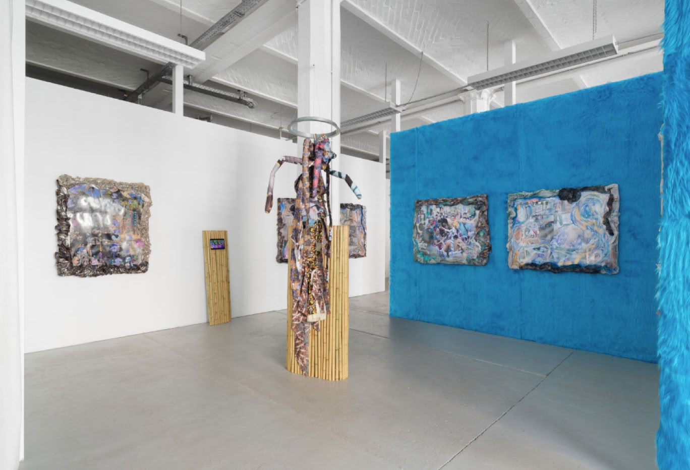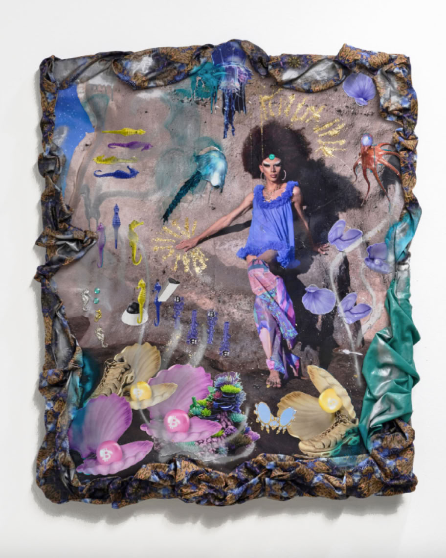 As an exhibition and installation, Cripto Sirenas expands into the physical space through an assemblage of different artifacts and media. The body and world as lovers and their transformations and mutations via technology become the central theme. Works are created through abstraction of the artist's bodies or by stilling their movement. Patterns created from documentary photographs and 3D stocks are printed onto fabrics, which morph into costumes for the performances within the video, and are then reconfigured into sculptural works depicting Sirena’s spirits in the exhibition space. Photographs of the artists’ bodies performing are abstracted and remade into geometric prints. Custom textile sculptures conceptualized by Sunny Pfalzer reference scenes from the video's choreography and morph into seating and cuddling sculptures for the visitors of the exhibition. A series of large mixed media collage works expands on the artists’ joint narrative and vision - here Ehrenstein collaborated with non-human agents through a plethora of tools and letting generative A.I. lead a conversation with documents of the performances, acrylic and oil painting, and textile prints. As with many of Ehrenstein’s works, collaboration, fluidity, and co-creation instead of individualism become a proposition for an alternative imagination of technology beyond extractivism, neocolonialism, and the accumulation of capital.